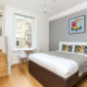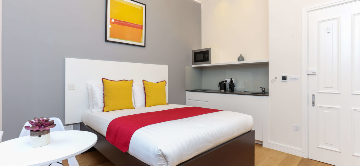 Inverness Terrace’s small and luxuriously formed small double studio apartments have every comfort you could wish for. With an airy, open-plan layout, light bounces off the stripped wooden floors giving a feeling of space in a very modern environment.