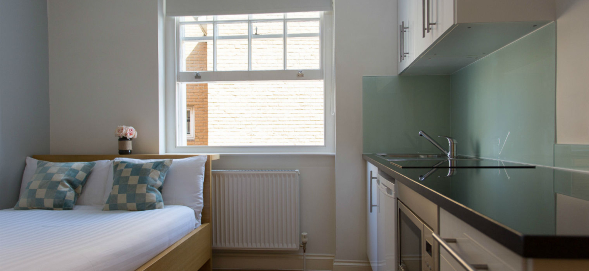 Paddington Green’s small and luxuriously formed small double studio apartments have every comfort you could wish for. With an airy, open-plan layout, light bounces off the stripped wooden floors giving a feeling of space in a very modern environment.